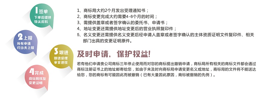 商標(biāo)核準(zhǔn)注冊(cè)后,商標(biāo)注冊(cè)人的名義、地址或其他注冊(cè)事項(xiàng)發(fā)生變更的,應(yīng)當(dāng)向商標(biāo)局申請(qǐng)辦理相應(yīng)變更手續(xù)。變更商標(biāo)注冊(cè)人名義或地址的,商標(biāo)注冊(cè)人應(yīng)將其全部注冊(cè)商標(biāo)一并變更。商標(biāo)變更可以是已經(jīng)獲準(zhǔn)注冊(cè)的商標(biāo),也可以是在申請(qǐng)中的商標(biāo)。