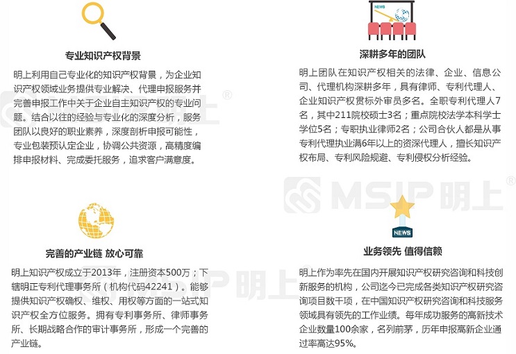 1、專業(yè)知識產(chǎn)權(quán)背景——明上利用自己專業(yè)化的知識產(chǎn)權(quán)背景,為企業(yè)知識產(chǎn)權(quán)領(lǐng)域業(yè)務提供專業(yè)解決、代理申報服務并完善雙軟認證中關(guān)于企業(yè)自主知識產(chǎn)權(quán)的專業(yè)問題。