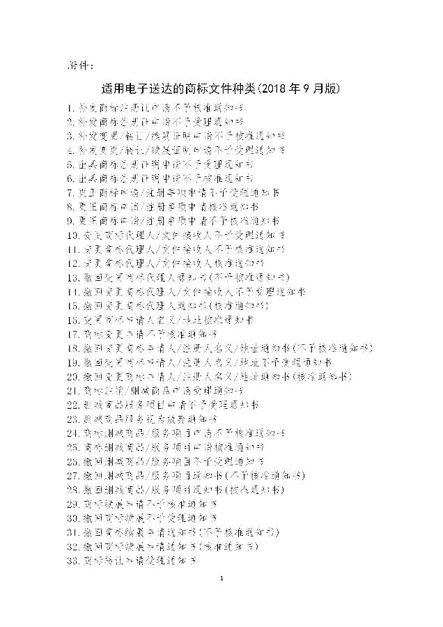 二、對于通過商標網(wǎng)上服務系統(tǒng)提交的商標申請所產(chǎn)生的部分種類商標文件(見附件),我局將采取電子文件方式送達,并同步發(fā)送短信和郵件提示,用戶可自行下載打印,不再以紙質(zhì)文件方式送達。隨著商標網(wǎng)上服務系統(tǒng)功能不斷完善,我局將逐步增加商標電子發(fā)文種類。