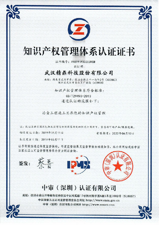 熱烈祝賀武漢精鼎科技股份有限公司于2019年9月獲得知識產權貫標認證證書,這意味著精鼎科技在知識產權領域獲得到重要認可,在知識產權方面得到進一步規(guī)范和在綜合競爭力得到進一步提升。