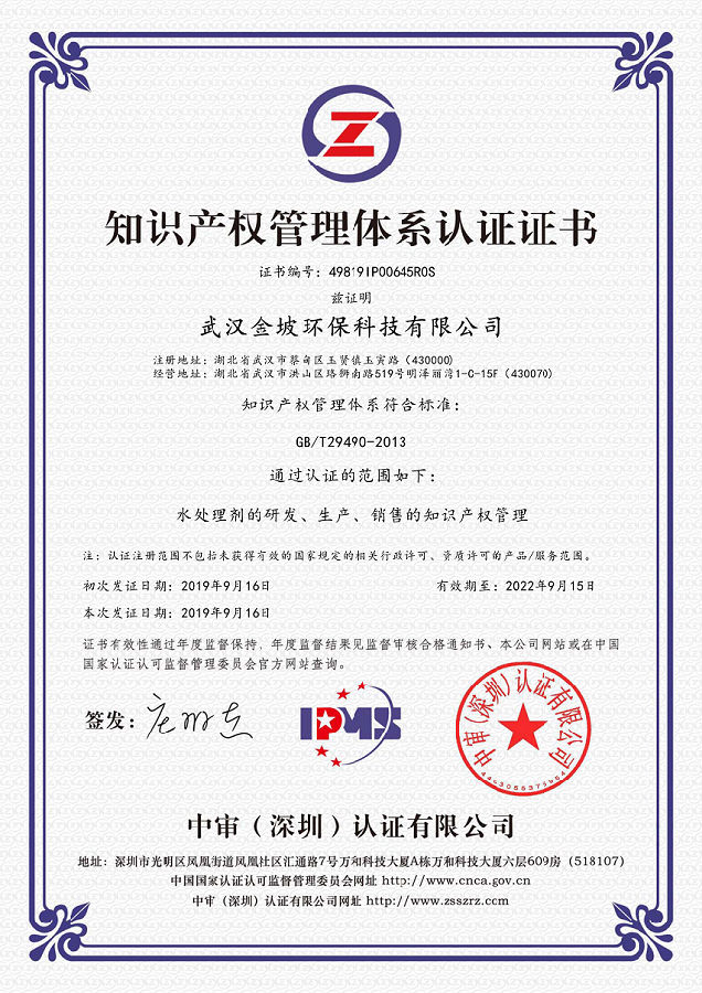 熱烈祝賀武漢金坡環(huán)保科技有限公司于2019年9月獲得知識產(chǎn)權(quán)貫標認證證書,這意味著武漢金坡環(huán)??萍加邢薰驹谥R產(chǎn)權(quán)領(lǐng)域獲得到重要認可,在知識產(chǎn)權(quán)方面得到進一步規(guī)范和在綜合競爭力得到進一步提升。