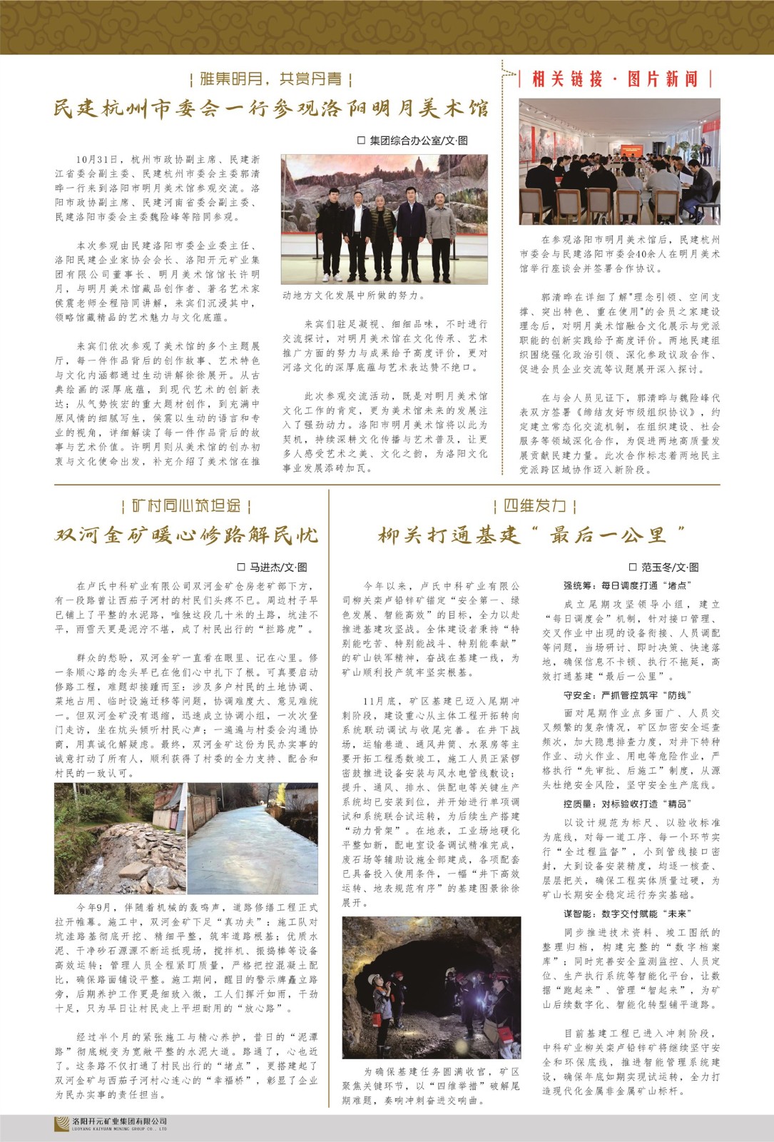 洛陽(yáng)開元礦業(yè)集團(tuán)有限公司簡(jiǎn)介洛陽(yáng)開元礦業(yè)集團(tuán)有限公司,始成立于2006年,位于洛陽(yáng)市開元大道269號(hào)。集團(tuán)旗下共有五余家全資子公司,業(yè)務(wù)涉及有色金屬礦山開發(fā)、礦產(chǎn)品購(gòu)銷與進(jìn)出口貿(mào)易、房地產(chǎn)開發(fā)、文化藝術(shù)、企業(yè)管理與咨詢、資本投資等多個(gè)領(lǐng)域。民建河南省委委員、民建河南省委企業(yè)委副主任、民建洛陽(yáng)市委委員、企業(yè)委主任、洛陽(yáng)民建企業(yè)家協(xié)會(huì)會(huì)長(zhǎng)許明月是公司創(chuàng)始人,現(xiàn)任洛陽(yáng)開元礦業(yè)集團(tuán)有限公司董事長(zhǎng)。在礦業(yè)領(lǐng)域,洛陽(yáng)開元礦業(yè)集團(tuán)擁有多家實(shí)力雄厚的子公司:貴州開元礦業(yè)有限公司探、采礦權(quán)面積共11.33平方公里;興??h銅鑫礦業(yè)有限公司探礦權(quán)面積8.76平方公里,礦山資源潛力巨大;2021年,開元集團(tuán)與盧氏中科礦業(yè)有限公司開展戰(zhàn)略合作。盧氏中科礦業(yè)有限公司專注于有色金屬的浮選、加工和銷售,擁有強(qiáng)大的技術(shù)支撐平臺(tái),是集探、采、選、冶、研為一體的中大型綜合礦業(yè)企業(yè)。目前,盧氏中科王家河1000噸選礦廠已成功投產(chǎn),雙河金礦、柳關(guān)欒盧鉛鋅礦相繼順利開工,樓房銀礦與圪老灣鉛鋅礦的深部探礦重大突破,標(biāo)志著礦山版圖取得重大進(jìn)展,為開元集團(tuán)后續(xù)發(fā)展奠定了堅(jiān)實(shí)基礎(chǔ)。在文化傳媒領(lǐng)域,洛陽(yáng)市明月美術(shù)館通過豐富多樣的藝術(shù)展覽、學(xué)術(shù)研討和公共教育活動(dòng),努力打造一個(gè)集展覽、交流、教育、研究為一體的綜合性藝術(shù)平臺(tái)。此外,在金融投資領(lǐng)域,開元集團(tuán)旗下的北京明峰資本管理有限公司專注于投資具有高增長(zhǎng)潛力的優(yōu)秀企業(yè),特別是高科技、新能源、環(huán)保等新興產(chǎn)業(yè),為客戶提供個(gè)性化的資產(chǎn)配置服務(wù)。在做好企業(yè)經(jīng)營(yíng)的同時(shí),開元集團(tuán)始終不忘企業(yè)的社會(huì)責(zé)任和家國(guó)情懷,以突出的愛心公益事跡,開展了一系列公益慈善活動(dòng):“民建林”公益事業(yè)通過“思源基金”“幫幫公益”線上公益平臺(tái),與眾多愛心人士籌措資金20余萬(wàn)元;資助541名貧困大學(xué)生共計(jì)270余萬(wàn)元,推進(jìn)“數(shù)字助力——河南AI人才培養(yǎng)”;捐款10萬(wàn)元,馳援京津冀、黑龍江洪水地質(zhì)災(zāi)害……公司于2017年底被洛陽(yáng)市慈善總會(huì)評(píng)為“洛陽(yáng)慈善風(fēng)云榜——十大愛心集體”。洛陽(yáng)開元礦業(yè)集團(tuán)有限公司秉承持續(xù)發(fā)展理念,憑借多年來良好的企業(yè)信譽(yù)與經(jīng)營(yíng)業(yè)績(jī),與全國(guó)多家企業(yè)建立了良好合作關(guān)系,受到社會(huì)各界的一致好評(píng),多次榮獲“納稅標(biāo)兵”“先進(jìn)企業(yè)”“招商引資模范企業(yè)”等榮譽(yù)稱號(hào)?;赝麃頃r(shí)路,開元人勠力同心,以“闖”的精神和“創(chuàng)”的勁頭,一路披荊斬棘,踏過千山萬(wàn)水;展望新未來,開元人凝心聚力,不執(zhí)于“舊”,無(wú)畏于“新”,秉承“勇于跨越,追求卓越”的企業(yè)精神,乘著國(guó)家高質(zhì)量發(fā)展新征程的東風(fēng),跨過高山,越過大海,向著集團(tuán)多元化、國(guó)際化的目標(biāo),逐夢(mèng)遠(yuǎn)航,跨越前行!